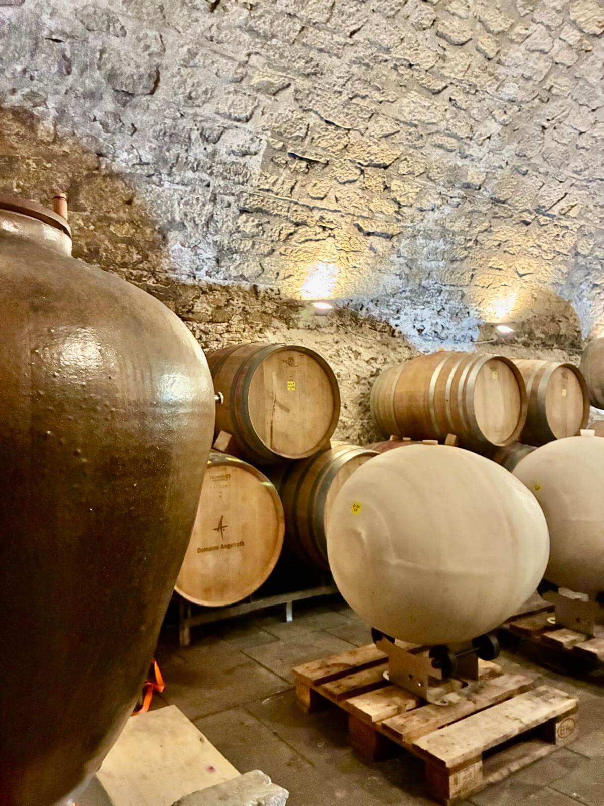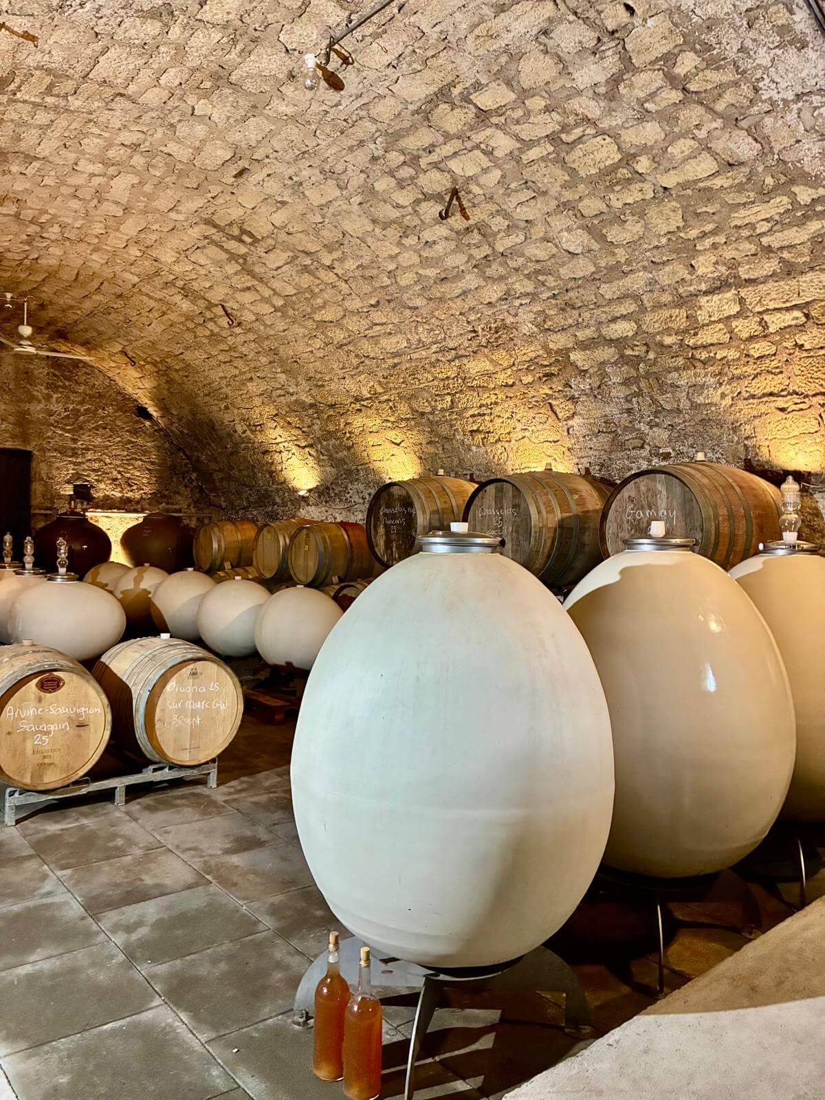 Puisque la folie n’exerce sa magie qu’avec une certaine maîtrise, encore faut-il, pour sortir des jus précis, avoir sélectionné avec soin les cépages, essayé moult assemblages, choisi et appréhendé les méthodes de vinification. Les vins élevés en jarres vinaires offrent une finesse appréciée du vigneron. Ainsi, dans la cave de Bain de Minuit, elles sont de différents types : oeufs couchés, dolium, en terre de Castelnaudary. Ces vaisseaux permettent au cépage et au terroir de se dévoiler pleinement. Pour apporter un peu de complexité, la plupart des vins finiront leur élevage en barrique.